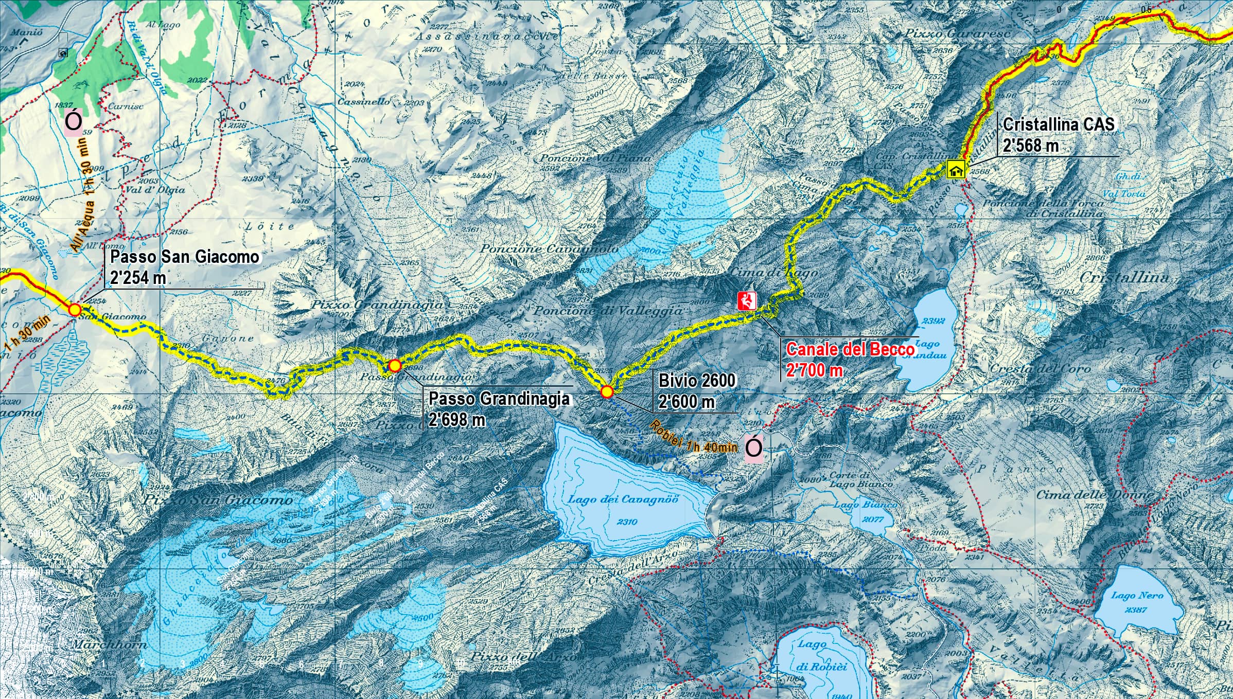 Raggiungere quota 2'000 metri semplicemente scendendo dal gradino dell’autopostale; un cartello tra i pascoli indica la fermata nei pressi della quale prende vita il fiume Ticino. Al panoramico refettorio della capanna Corno Gries - dove vale la pena pernottare - tazza fumante e sguardo catalizzato dalle creste merlate della Valle Bedretto prima di addentrarvisi. Si attraversano i fianchi di tante montagne, il verde pianoro del Passo San Giacomo segna il confine invisibile tra Svizzera e Italia e quello visibilissimo tra i pendii erbosi esposti a meridione e quelli rocciosi rivolti a settentrione. Nei duecento metri del Canale del Becco si concentrano le sfide acrobatiche della giornata: corde e staffe metalliche consentono un’ascesa che resta da brivido. Poco sotto la Cima di Lago avrete raggiunto la quota più alta della Via Idra: 2'800 m.